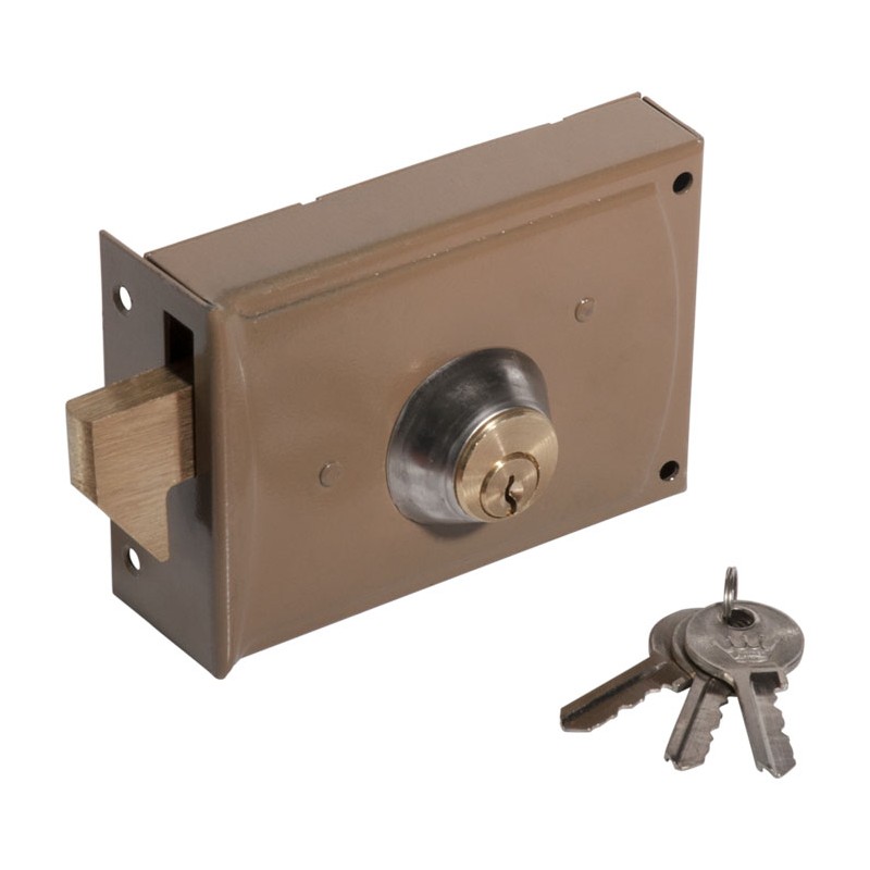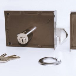 Fechadura de sobrepor modelo 720 - Direita Modelo com cilindro tipo 720 em cavilha (maciça) de latão polido. Comprimento da caixa 8cm Altura da caixa 8.5cm Comprimento do cilindro 40cm. Caixa em chapa de ferro. Língua e Trinco em cavilha de latão polido. Fornecida com três chaves em latão(2,2 mm espessura). Caixa ferro pintado (1,5mm).